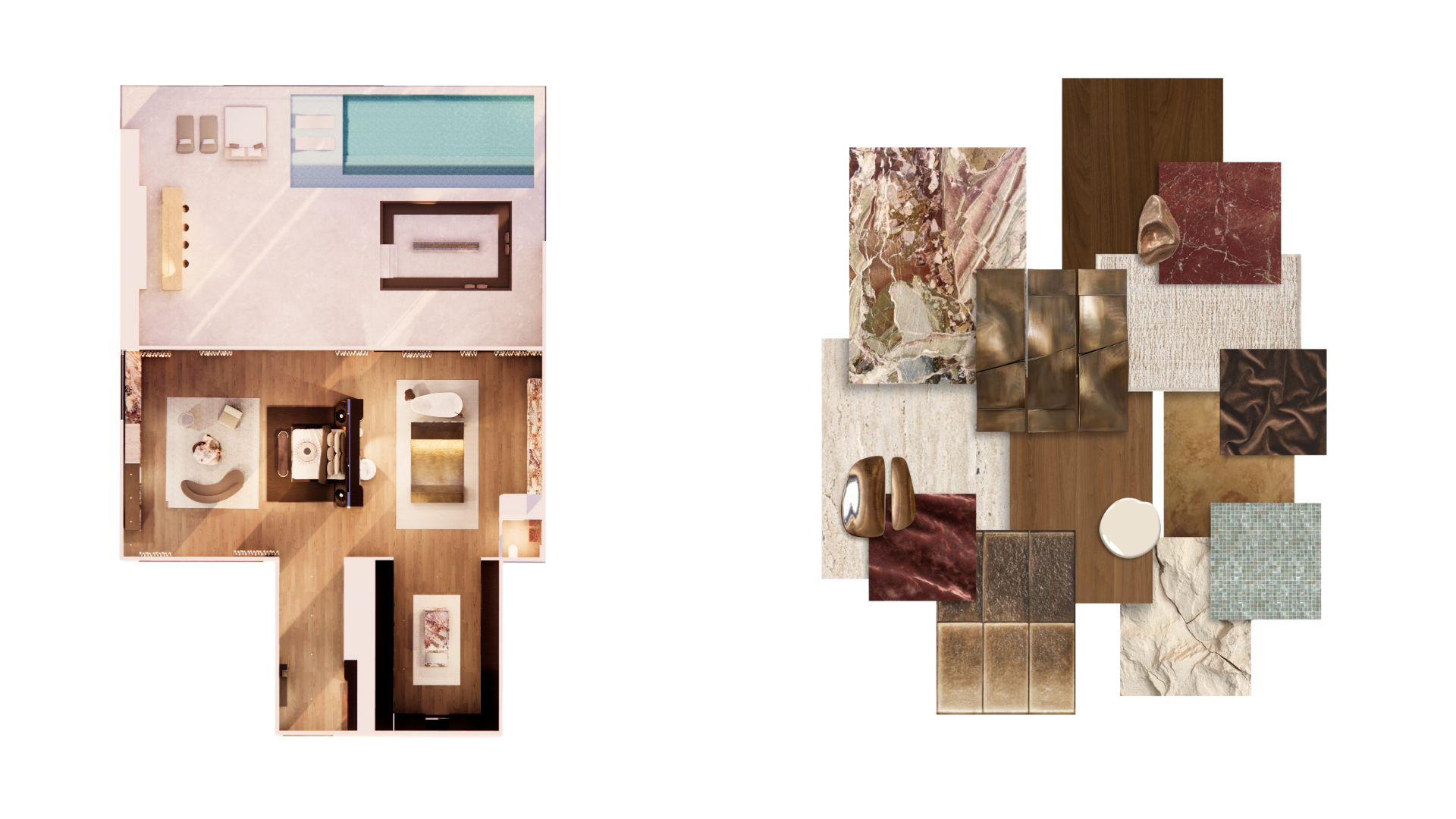 Conçue pour un couple passionné d’art, la suite joue sur les contrastes. L’audace rencontre la tradition, l’élégance adoucit la rudesse des matériaux, et l’ouverture redéfinit l’intimité.